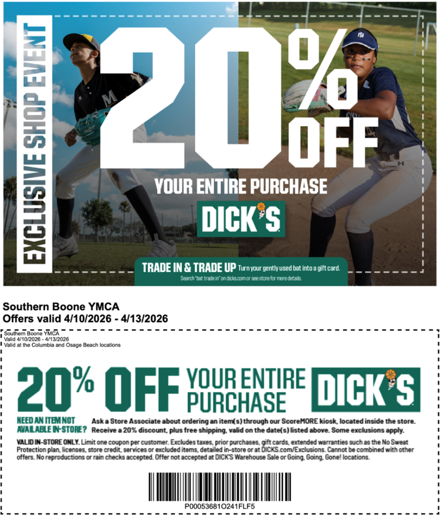 From April 10-13, 2026, enjoy 20% OFF your entire purchase at DICK’S Sporting Goods when you shop in-store at the Columbia and Osage Beach locations.