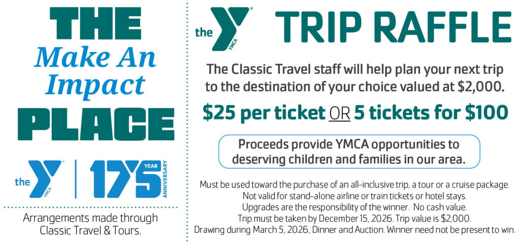 Support the YMCA’s Outreach Fund when your purchase tickets for a chance to win a travel voucher from Classic Travel valued at $2,000!