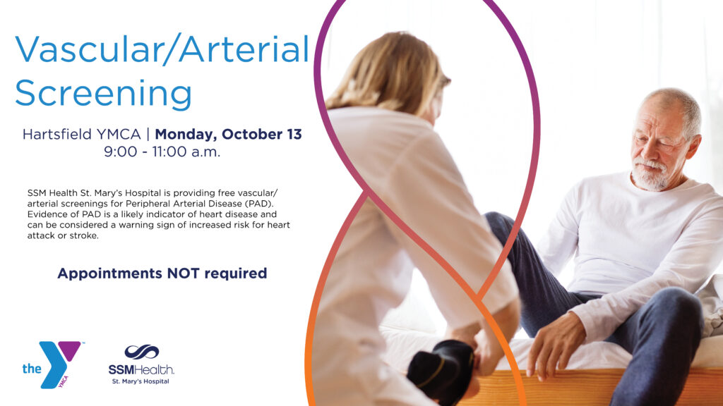 SSM Health St. Mary’s Hospital is providing free vascular/arterial screenings for Peripheral Arterial Disease (PAD). Evidence of PAD is a likely indicator of heart disease and can be considered a warning sign of increased risk for heart attack or stroke. Stop by the Hartsfield Y on Monday, October 13 from 9-11 a.m.